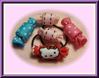 Bright pink and Blue Sweet --- $6 each (Add $1 to put on ponytail band or clips) Kitty sweet on ponytail band or clip-- $7.00 each (Add $1 to put on ponytail band or clips)